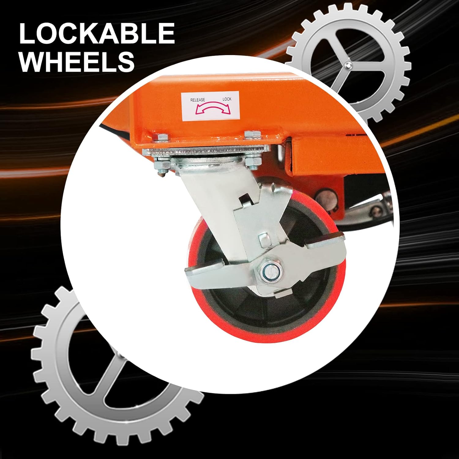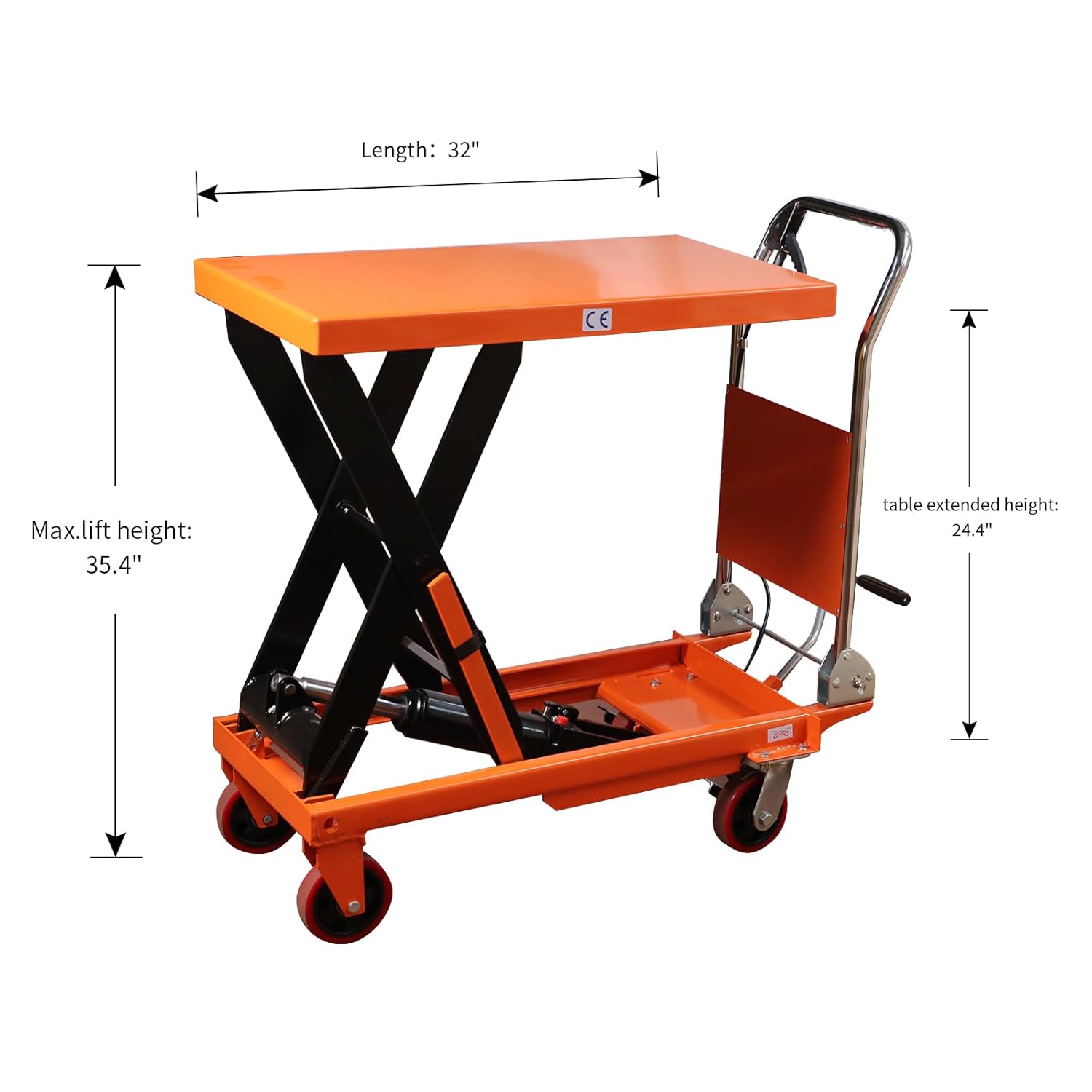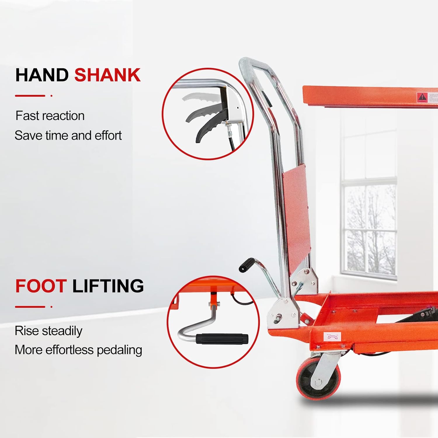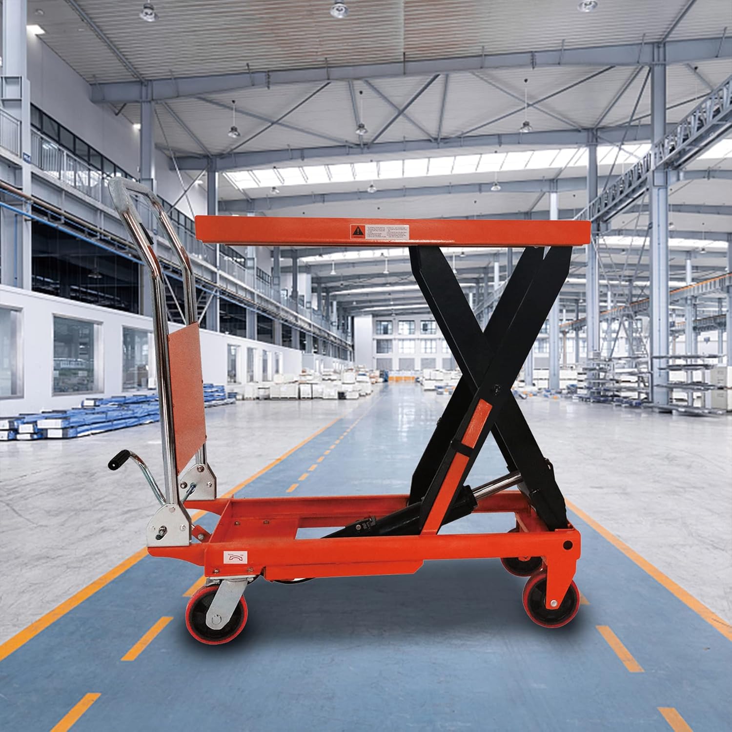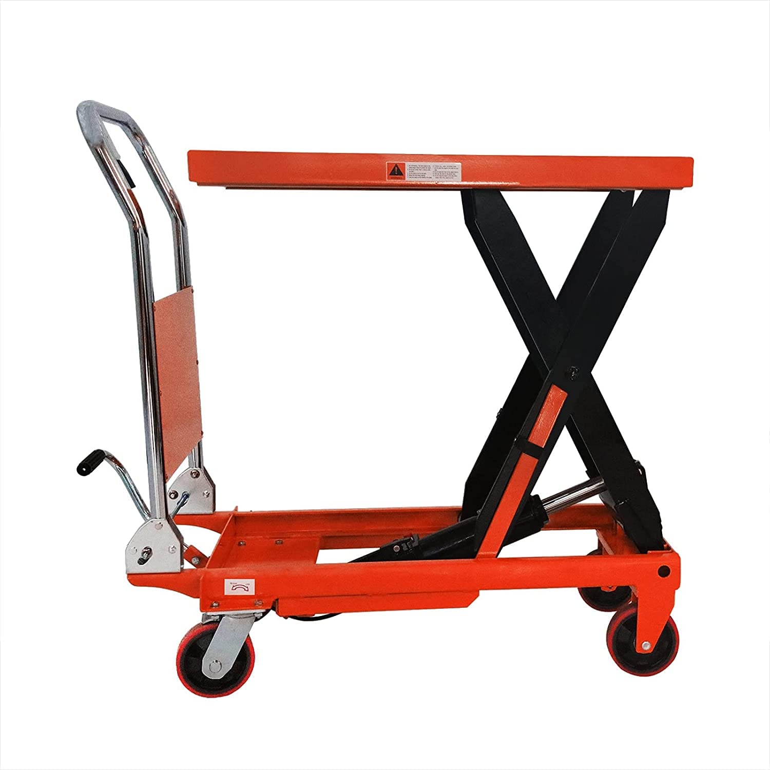 Tory Carrier Scissor Lift Table includes a lifting design with a manual hydraulic table pump to boom up and down. This lift table lift and lower loads. A durable hydraulic pump ensures the scissor lift table a long service life. Safety back guard. The lift table is designed for vertical lifting only. Do not use the unit for lifting personnel or overhead lifting.