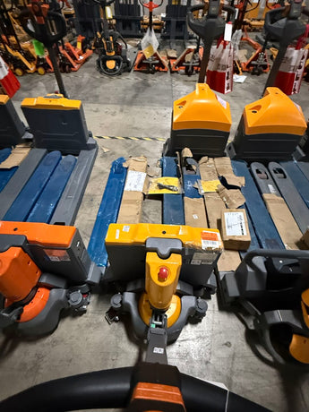 Powered by a 24V/20Ah lithium battery, this electric pallet truck features an ergonomic handle with a belly switch, an emergency reverse button, and a turtle speed button for precise control in tight spaces. The one-piece rocker arm ensures durability, while the horizontal motor simplifies maintenance. Equipped with floating balance wheels for added stability, an external charger connector, and a single fork roller, it is the ideal choice for efficient material handling.