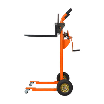 Cada unidad funciona como elevador de materiales accionado por cabrestante y como plataforma compacta para palés, gracias a su plataforma de acero integrada y diseño ergonómico. Las ruedas giratorias de goma y las horquillas ajustables proporcionan una movilidad fluida y flexibilidad para diversos tamaños de carga, lo que la hace ideal para pasillos estrechos de almacenes, tiendas o talleres domésticos.