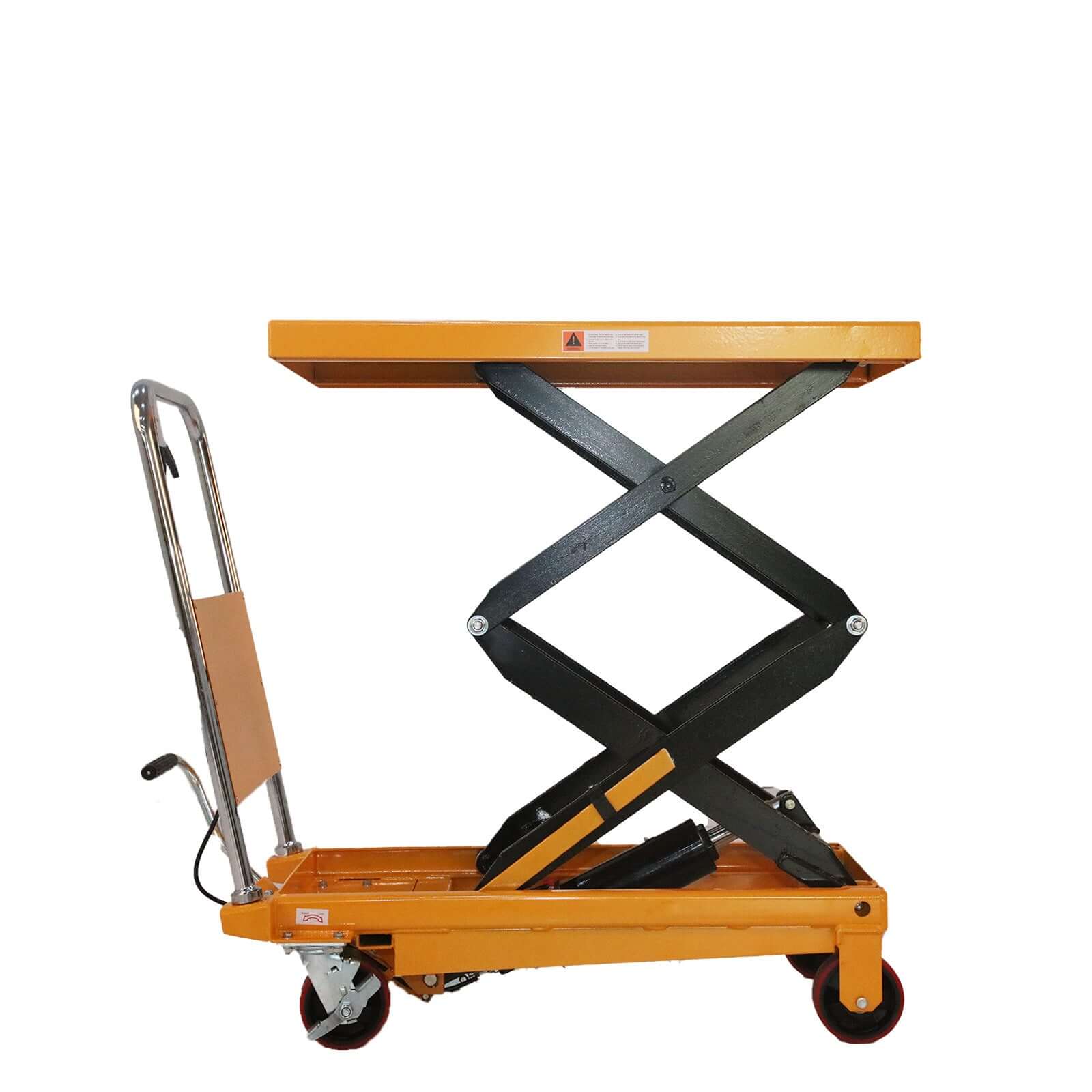 La table élévatrice à ciseaux Tory Carrier est équipée d'une pompe hydraulique manuelle pour le levage et l'abaissement des charges. Cette table élévatrice permet de lever et d'abaisser les charges. Une pompe hydraulique robuste assure une longue durée de vie. Une plaque de support latérale assure la sécurité de l'opérateur. Cette table élévatrice est conçue pour le levage vertical uniquement. Ne l'utilisez pas pour le levage de personnel ou en hauteur.