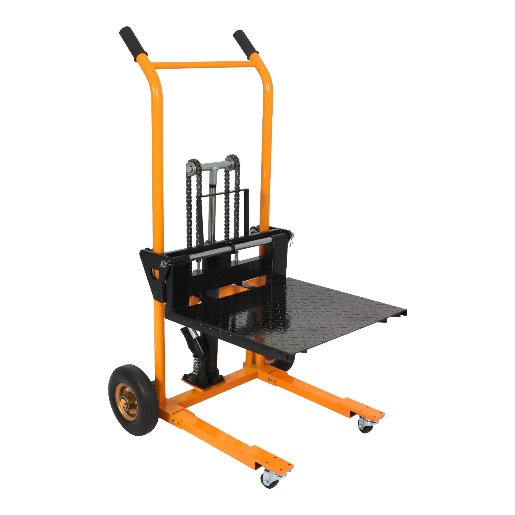 La pompe hydraulique à pédale assure un levage sans effort, tandis que la poignée antidérapante et la pédale avec valve de décharge offrent un contrôle sûr et précis pendant le fonctionnement. Un mécanisme à double chaîne renforcé et une finition thermolaquée épaisse garantissent une durabilité, une résistance et une fiabilité accrues à long terme.