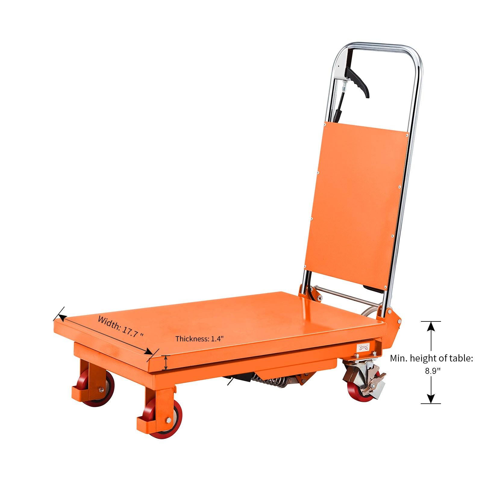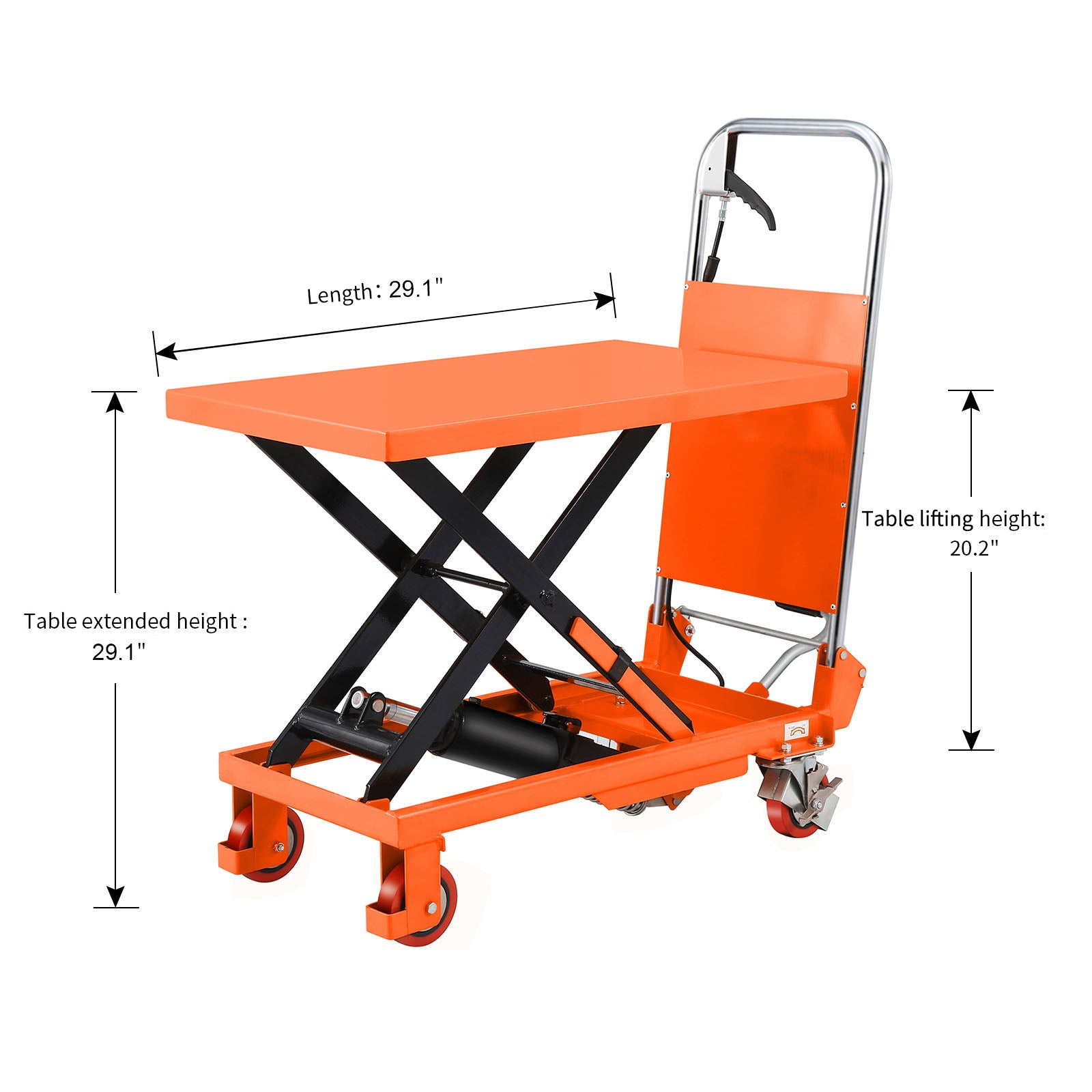 Tory Carrier Scissor Lift Table includes a lifting design with a manual hydraulic table pump to boom up and down. This 330lbs lift table lift and lower loads. Convenient finger release smoothly lowers even heavy loads. Safety back guard. The unit is designed for vertical lifting only. Do not use unit for lifting personnel or overhead lifting.